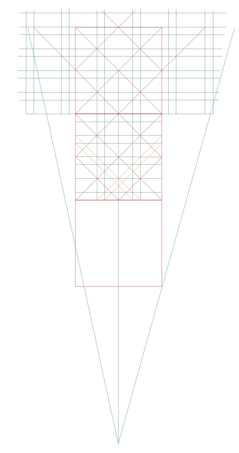 At last it is worth noting how Tiepolo conceived the stripes, each which of them has its own proportional role. Right inner edge of the left stripe is coming from the vanishing point through the point C1 to the corner of the bottom square. And the inner left edge of the right stripe is running through the point C2 to the corner of the bottom square. The outer edges are running to the points Dc1 and Dc2. Points C1 and C2 define the lateral points on the horizon, and points Dc1 and Dc2 defines the distance points on the horizon.